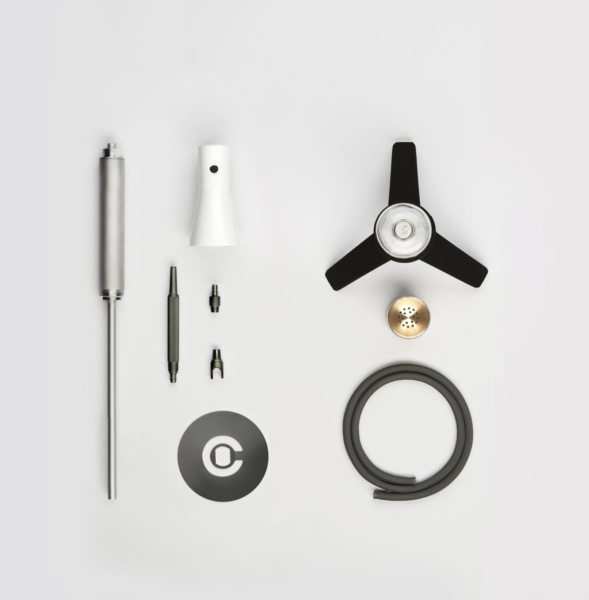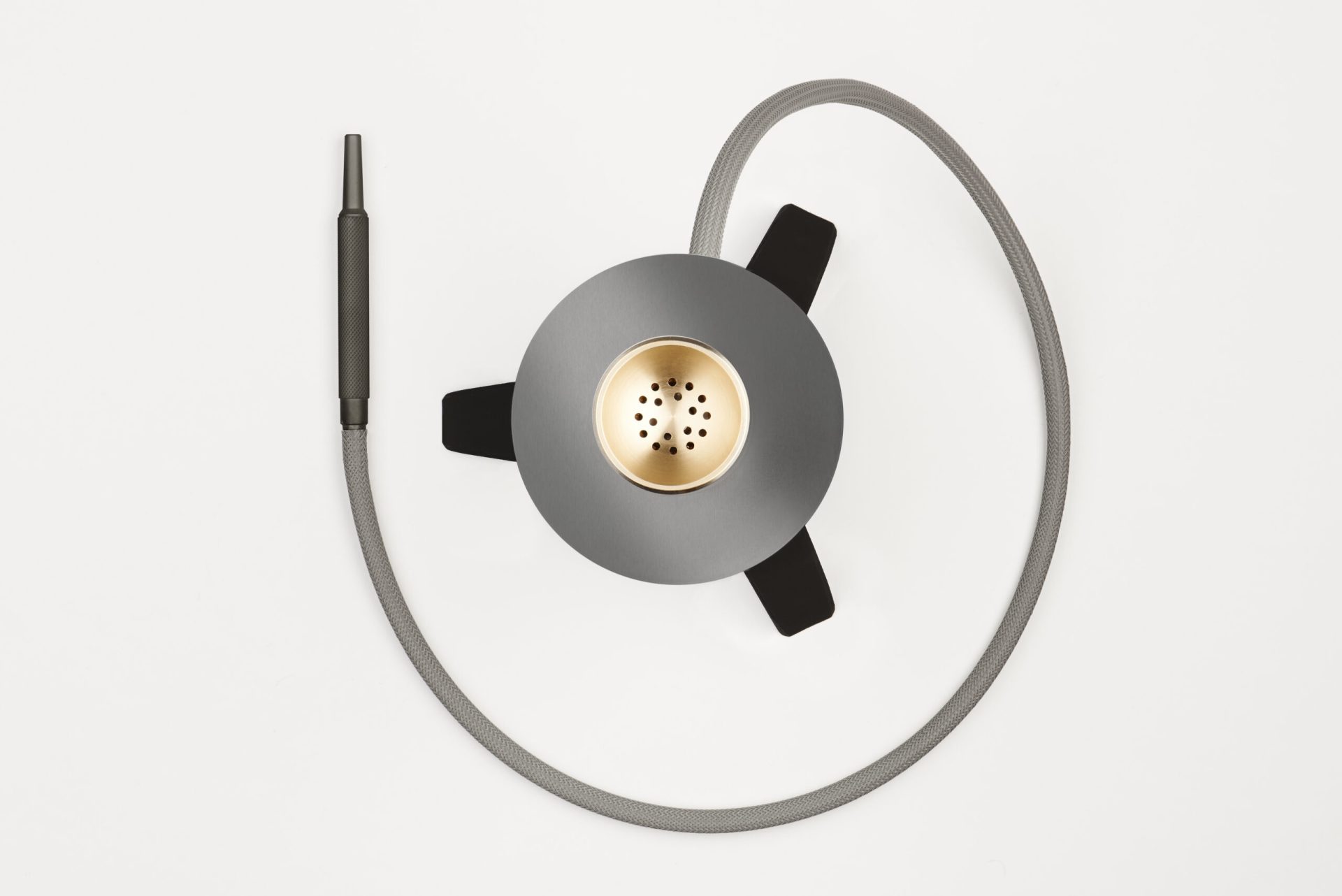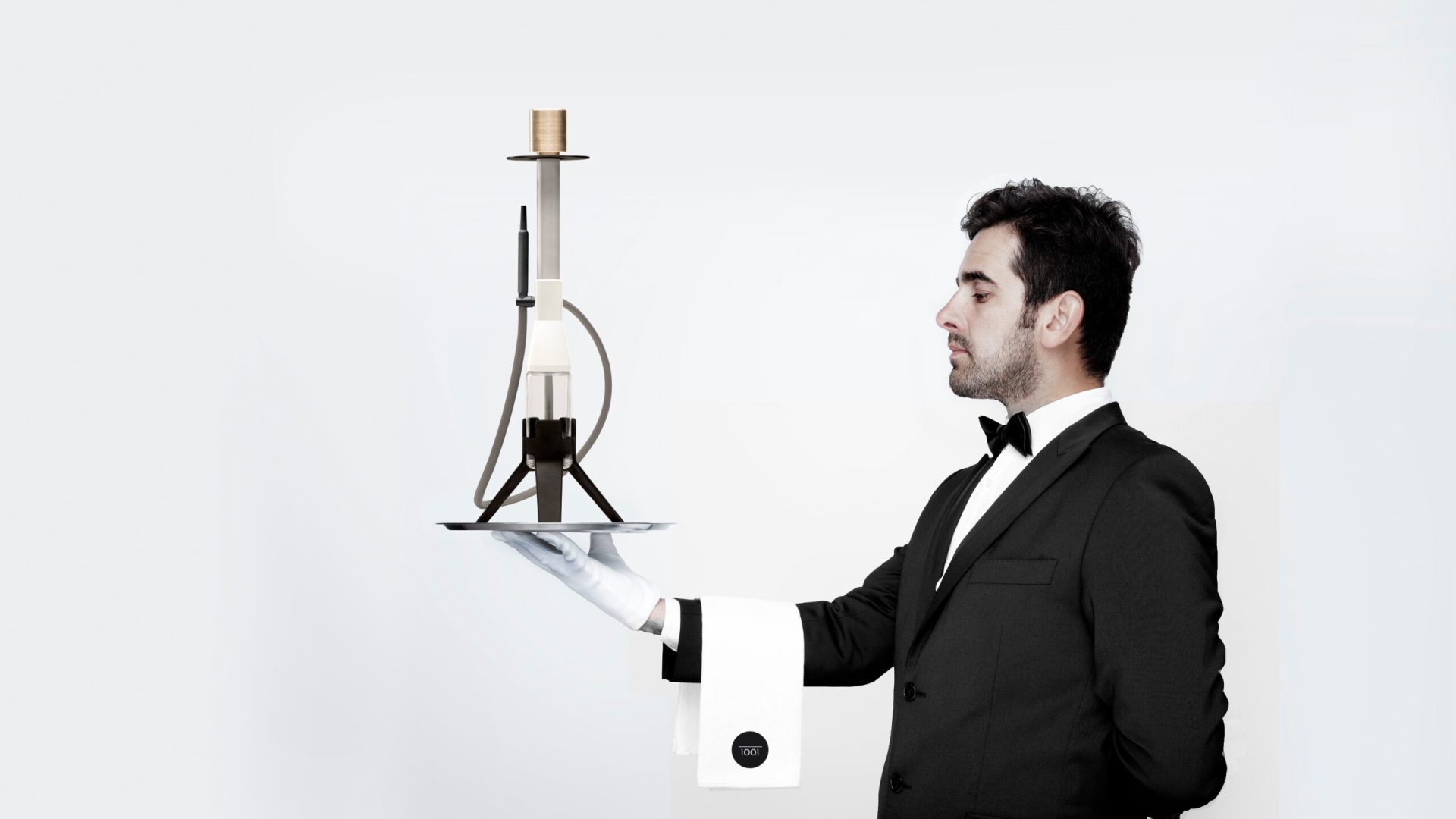 Design of IOOI, the modern hookah. Radical, simple and elegant. Sophisticated materials are presented in a minimalistic an extraordinary way. Modern materials, like anodised aluminium, polished brass, crystal clear glass and 3D printed metal parts are composed to this outstanding sculpture.