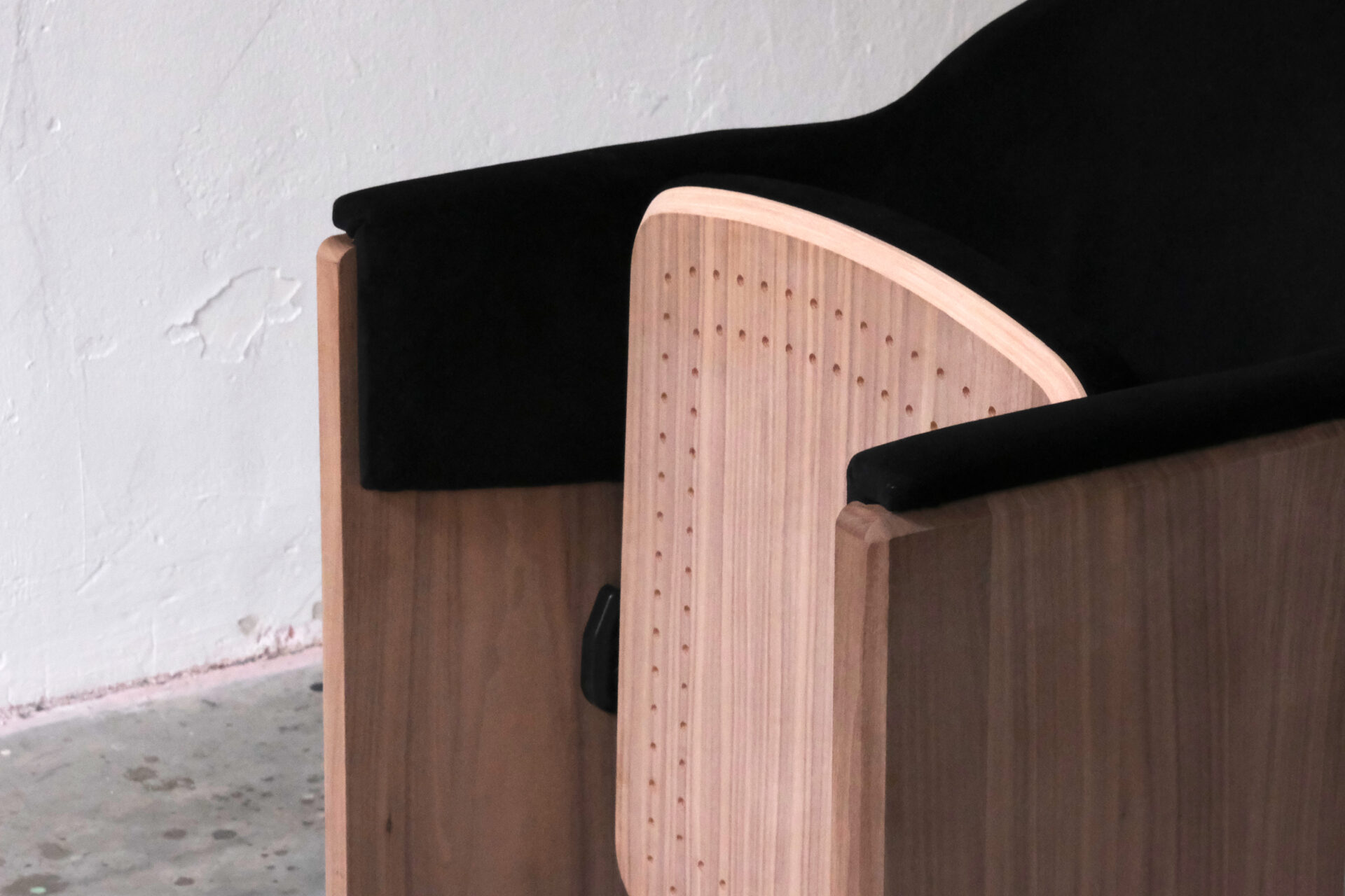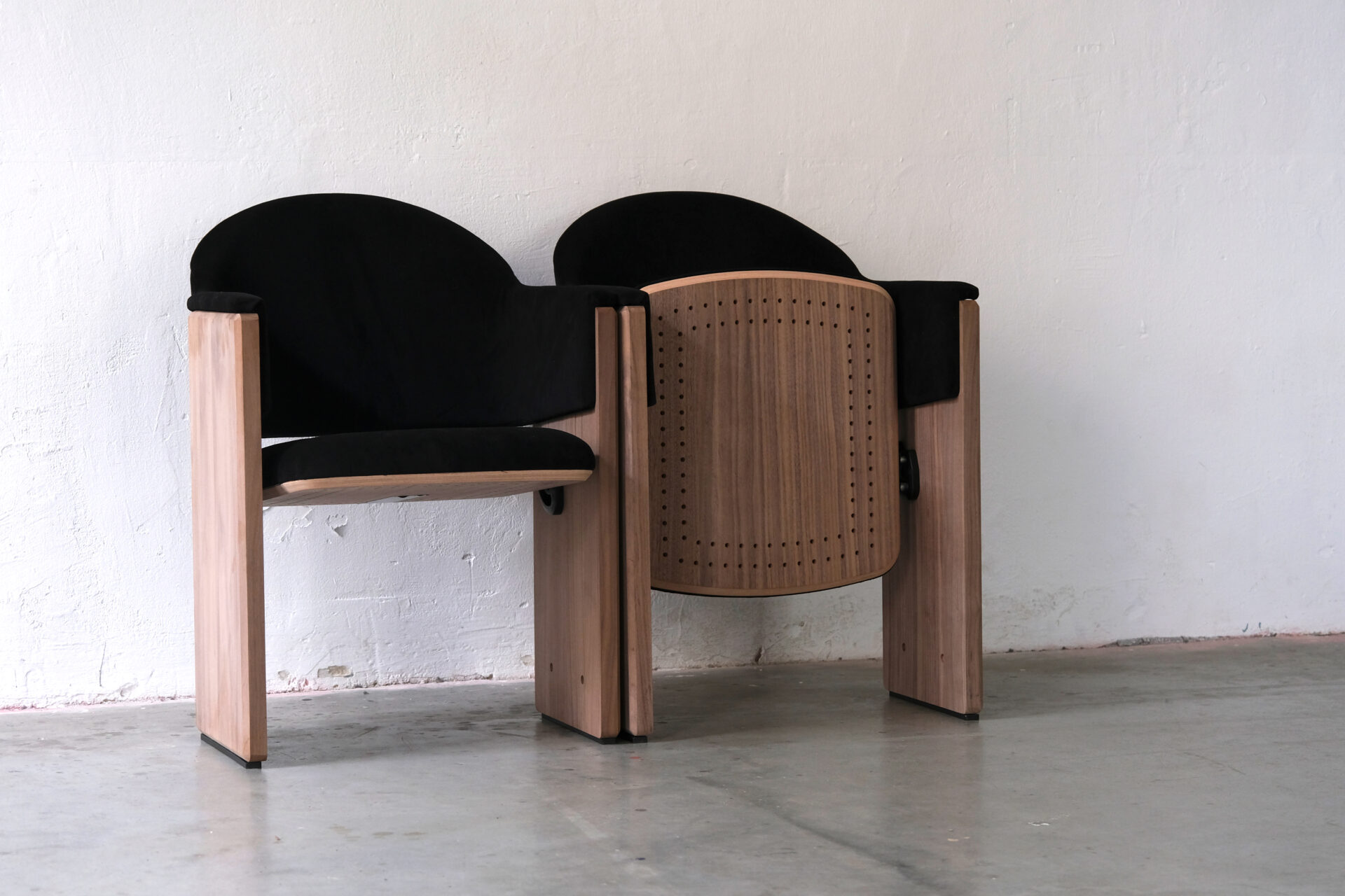 With no complete reference for the original seating, we pursued a hybrid approach. The new chair adopts the clarity and restraint of the historic model while integrating the comfort and ergonomics expected today. Wooden side panels echo the historic vocabulary, while the continuous backrest extends into individual armrests to enhance comfort. Softly upholstered inner surfaces invite leaning back without adding visual heaviness, and the perforated underside subtly references historic motifs while improving acoustics.
